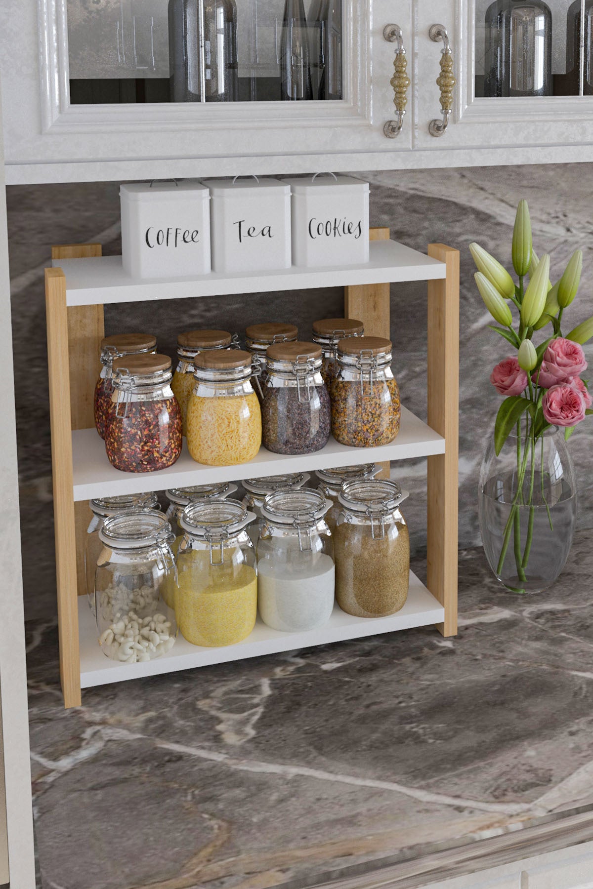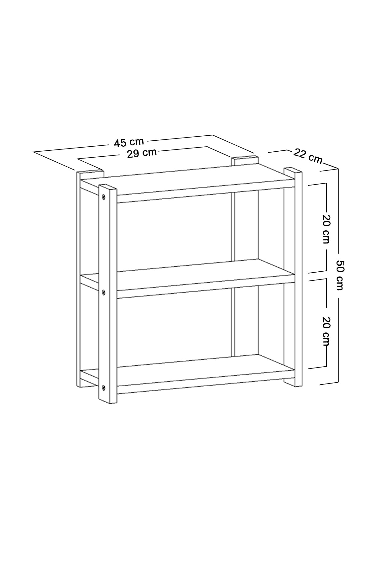 Çok Amaçlı Tezgah Üstü Raf ile Mutfak , Banyo , Balkon , Kiler gibi odalarınızda tüm ürünlerinizi derler ve size daha fazla alan sağlar. Baharatlık , Havluluk , Sabunluk veya çok amaçlı raf olarak kullanılabilir. Baharatlık Ölçüleri : Genişlik 45cm , Derinlik : 22cm , Yükseklik : 50cm ; Her raf arası 20cm'dir. ; ; Ürün toplam üç katlıdır. ; ; Renk Ceviz ; raflar beyaz renk. ; ;